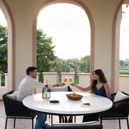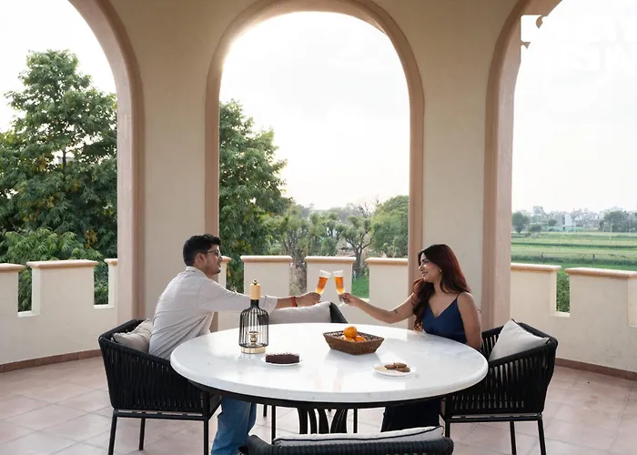 The kitchen amenities at Stayvista'S Mystic Castle With Terrace, Swimming Pool, Lawn With Gazebo villa feature a refrigerator, provided in an outdoor dining area. Stayvista'S Mystic Castle With Terrace, Swimming Pool, Lawn With Gazebo villa can be reached by car in 18 minutes from Jaipur airport.